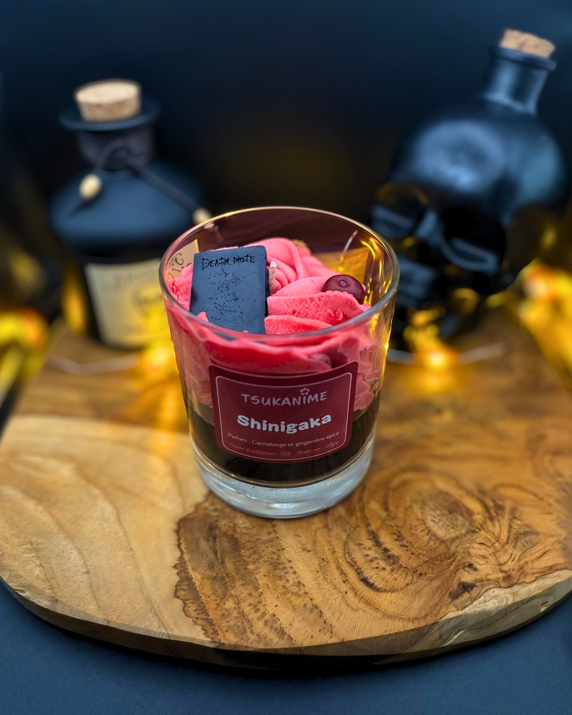 Le modèle Shinigaka est une bougie artisanale inspirée de l’univers sombre du Death Note. Son design évoque le célèbre cahier du Shinigami et la pomme.